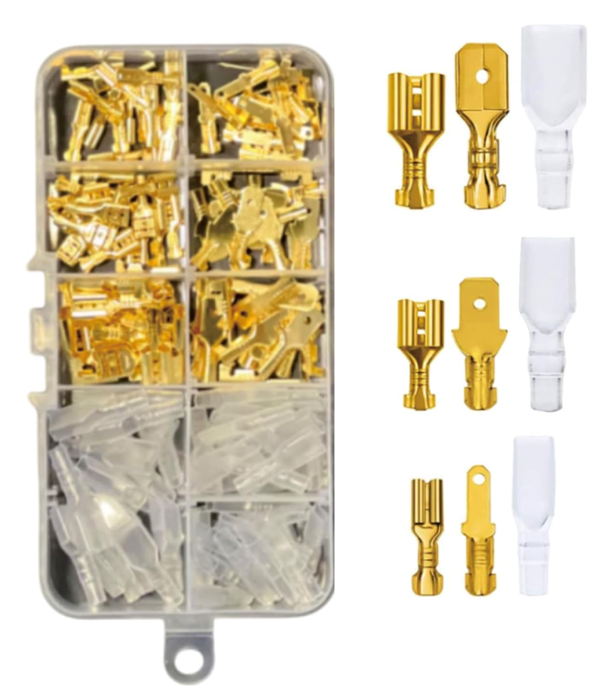 圧着端子セット, メス・オス平型端子 135個, 絶縁スリーブ付き, 収納ケース付き, 金色・白色