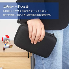 64ゲームホルダー:ゲームコレクションは4つの同サイズのフラップが内部にあり、64枚のゲームカードをしっかりホールドできるエラスティックポーチを特徴としています。各ゲームカートリッジはエラスティックポーチに収められるため、動きや衝撃から守られます。
